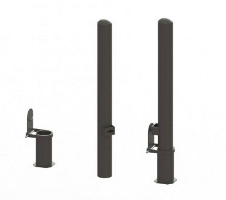 limitador metálico de passeio em tubo redondo diâmetro 90mm, na cor cinza forja, extraível com chave para retirar e recolocar, chumbada ao pavimento com tampa. Medida de 80cm altura