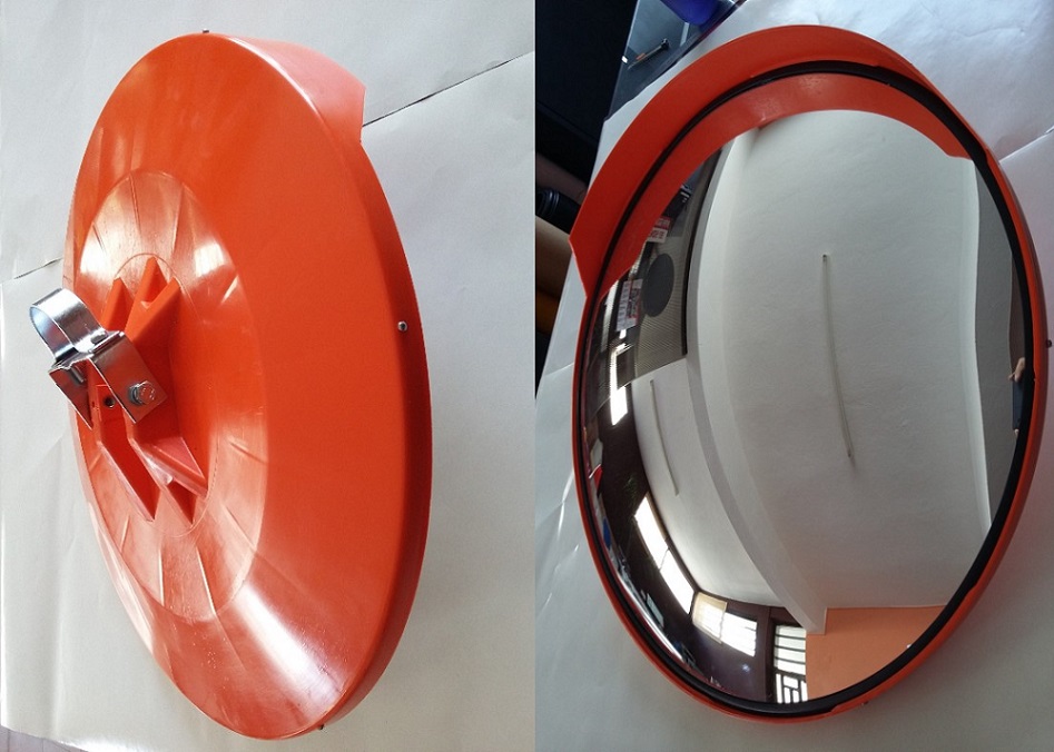 Espelho convexo em plástico laranja com pala. Com acessórios de aplicação a prumos.