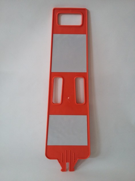 Lamela para flat cone, em plástico vermelho, com duas faixas de tela branca refletora em ambos os lados. Furação para melhor movimentação e transporte.