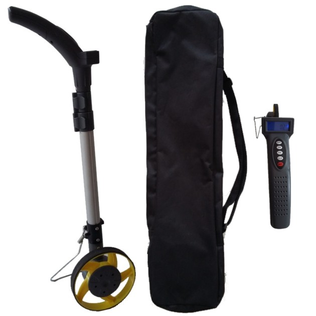 Roda de medir digital em alumínio extencível, com mostrador digital. Pega em plástico e apoio lateral para ficar em pé, roda em plástico e borracha com o diâmetro de 16cm Saco incluído para transporte