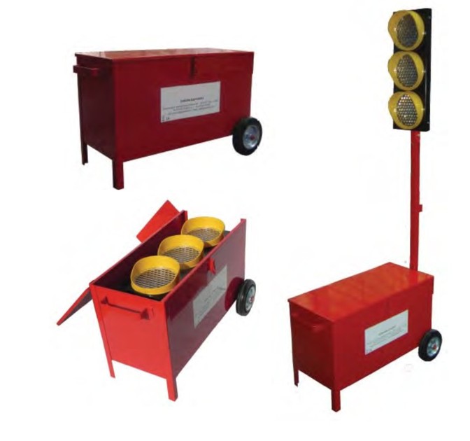 Semáforo de obra em cor vermelha. Com focus de luz em leds, caixa para guardar a bateria e as luzes, comandos incluídos. Não inclui bateria.